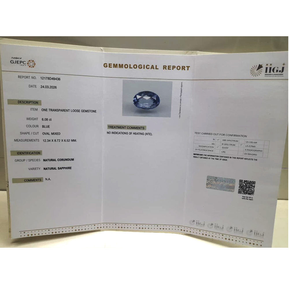 Buy Original and IIGJ (Govt.) Lab Certified Blue Sapphire 6.08 Cts. photos and videos are available online. Blue Sapphire is the most powerful Astrological Gemstone related to Saturn planet. Neelam (Blue Sapphire Gemstone) has many benefits like professional and marital life, health benefits, blesses a person with immense good luck, wealth and prosperity. For best astrological results, the value and price of stones is good considering its properties and effects. Cut color and clarity are best for astrological purpose. Can be used in ring and pendant.