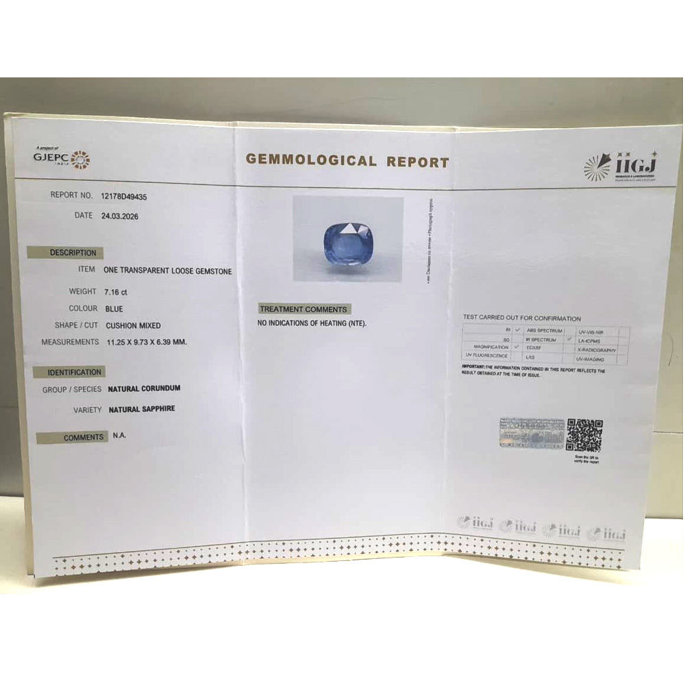 Buy Original and IIGJ (Govt.) Lab Certified Blue Sapphire 7.16 Cts. photos and videos are available online. Blue Sapphire is the most powerful Astrological Gemstone related to Saturn planet. Neelam (Blue Sapphire Gemstone) has many benefits like professional and marital life, health benefits, blesses a person with immense good luck, wealth and prosperity. For best astrological results, the value and price of stones is good considering its properties and effects. Cut color and clarity are best for astrological purpose. Can be used in ring and pendant.