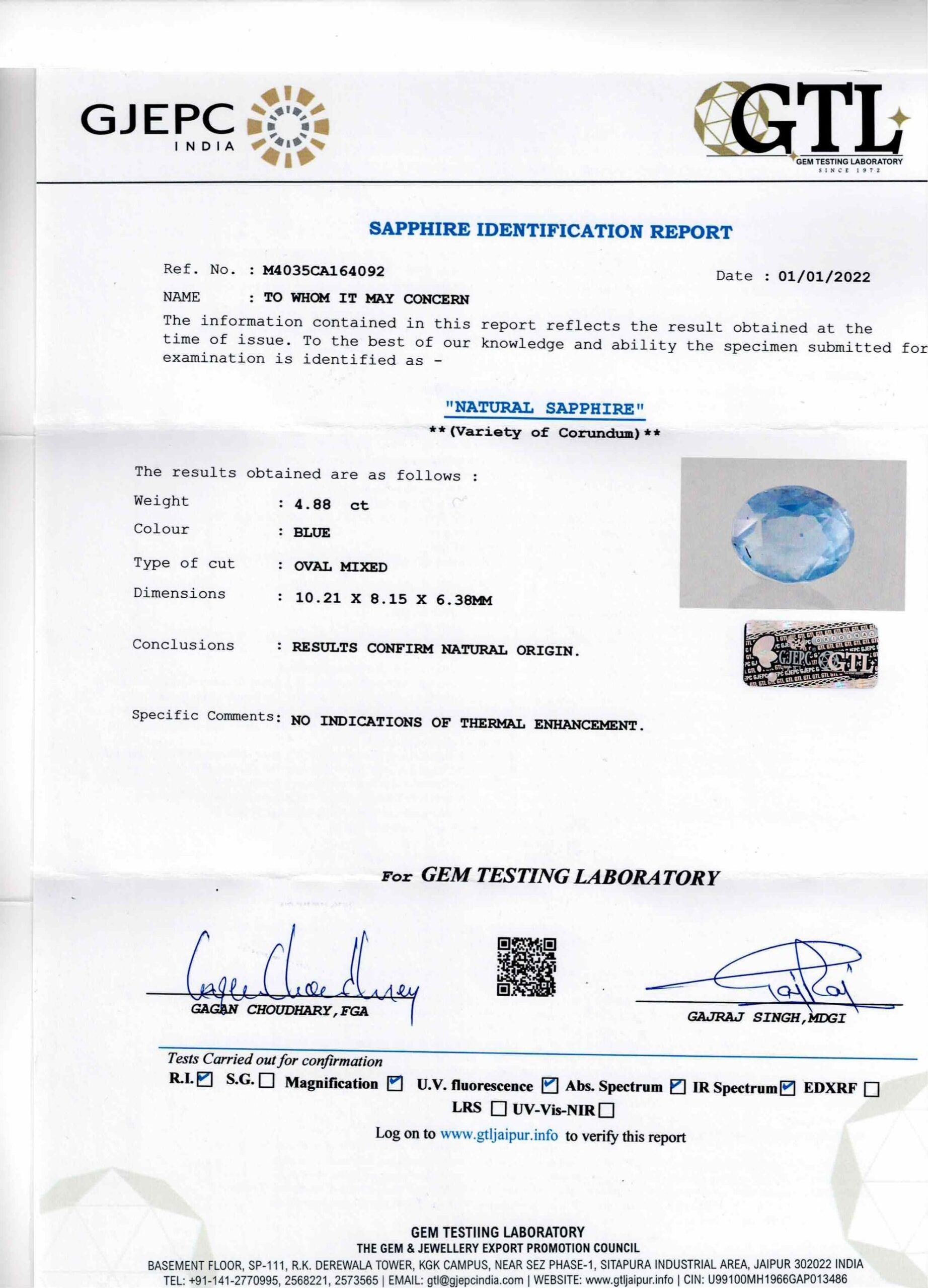 Buy Natural Blue Sapphire 4.88 Carat 5.36 Ratti from Ceylon (Sri Lanka). This Blue Sapphire is 100% Natural and comes with IGI-GTL (Govt. Lab) Certificate.