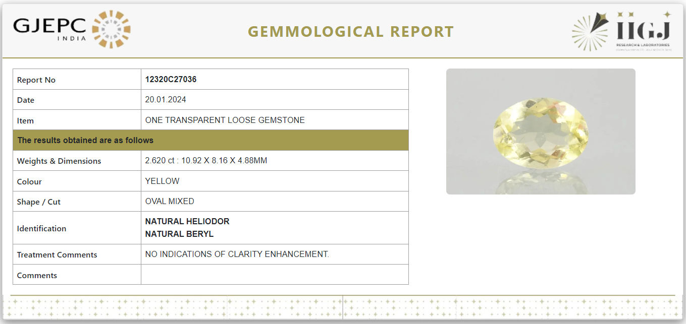 This Yellow Beryl (Heliodor) is a Natural gemstone and comes with a GJEPC (Govt. Lab) certificate of Authenticity. This beautiful gem is from India.