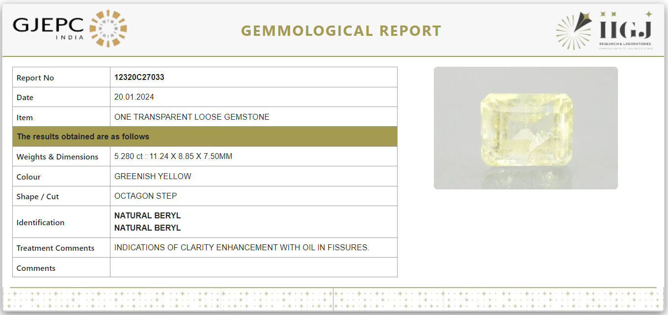 Buy Natural and IIGJ (Govt. Lab) certified Yellow Beryl (Heliodor) online. Yellow Beryl (Heliodor) is the best in the variety of Beryl Stones. This gemstone is known as the substitute for Yellow Sapphire (Pukhraj). Yellow Beryl gemstone is suggested for Dhanu (Sagittarius) and Meen (Pisces) Rashi.Hindi name is peela Baruz. It brings a positive impact on the wearer?s career, financial status, and health. For best astrological, the value and price of stones is good considering its properties and effects.
