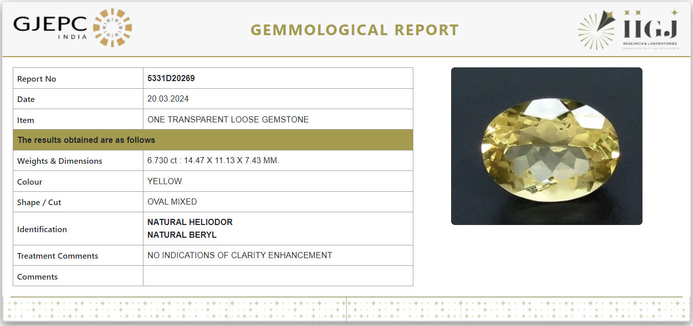 This Yellow Beryl (Heliodor) is a Natural gemstone and comes with a GJEPC (Govt. Lab) certificate of Authenticity. This beautiful gem is from India.