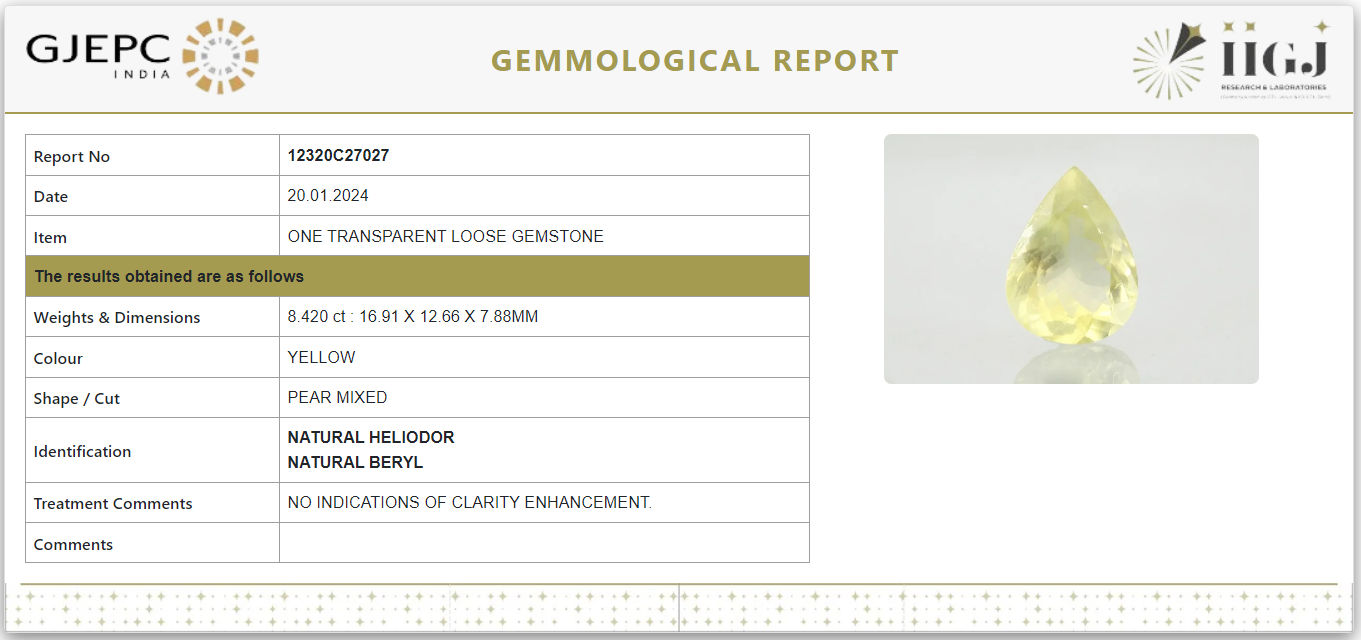This Yellow Beryl (Heliodor) is a Natural gemstone and comes with a GJEPC (Govt. Lab) certificate of Authenticity. This beautiful gem is from India.
