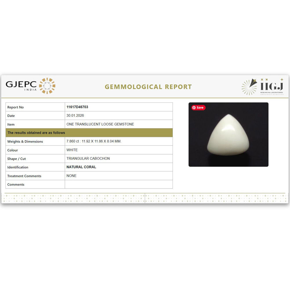 Buy 100% Natural White Coral 7.86 carat IIGJ (Govt.Lab) Certified