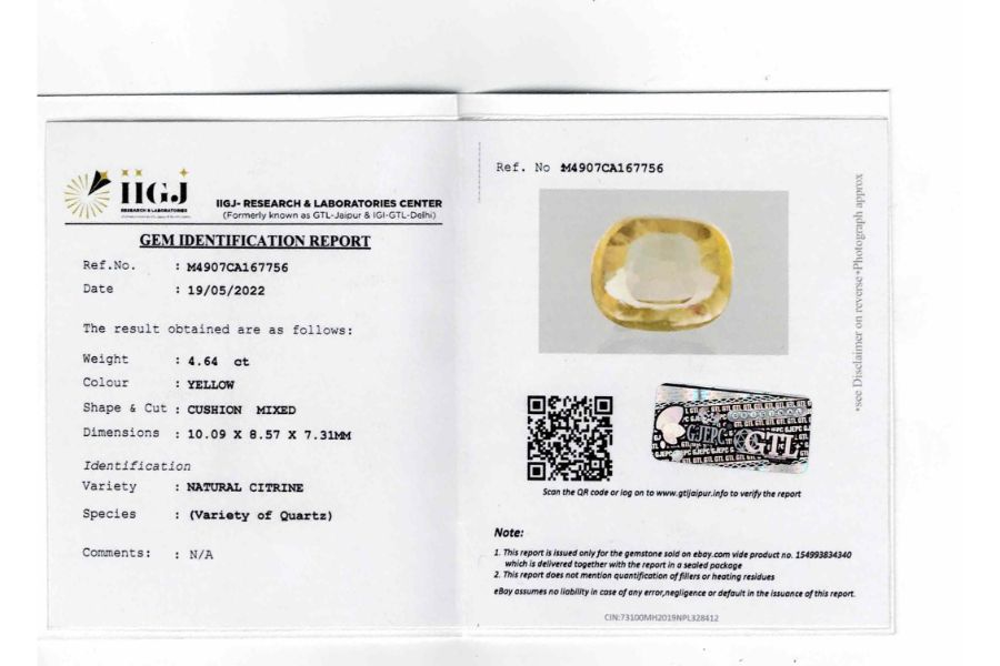 Yellow Citrine 4.64 Carat (5.10 Ratti)