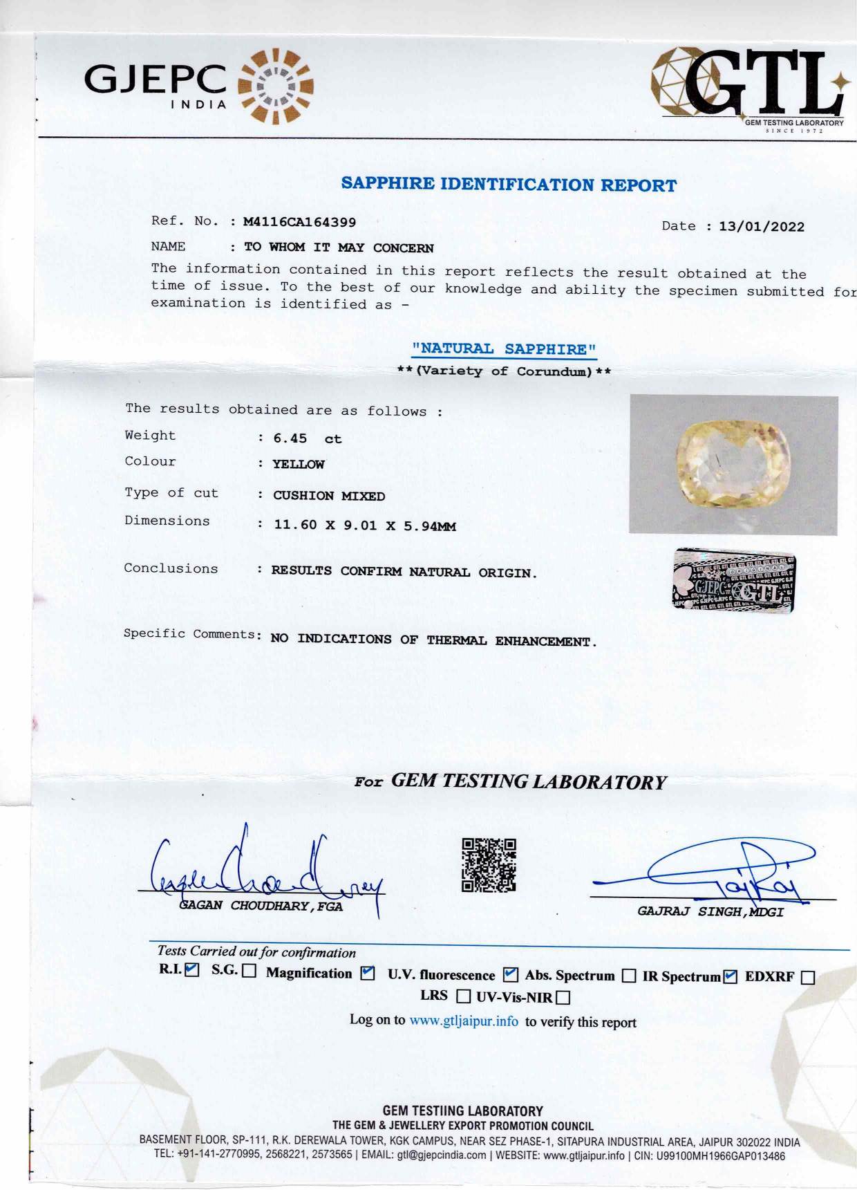 Buy Original and Certified Yellow Sapphire (Pukhraj Rashi Ratna) for sale online 6.41 cts. 7.09 Ratti. This Pukhraj is lab certified and its photos videos and certificates are available online. The Stone origin (Where is found ) is Sri Lanka (Ceylon). The Stone is known as Ceylon yellow sapphire or Srilankan Yellow sapphire. Pukhraj Stone has many benefits like Business, Finance, Career, Marriage, child conceive. For best astrological benefits stones is unheated, untreated 100% natural. The value of stones is good considering its properties and effects.